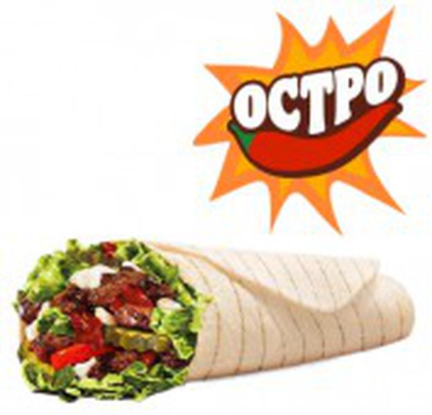 Состав: Это острая версия любимого Воппер Ролла — со жгучим соусом вместо кетчупа! Ломтик томата, салат Айсберг, лук, маринованные огурчики и 100%-я говядина на огне под острым томатным соусом! Как острый Воппер, только ролл!