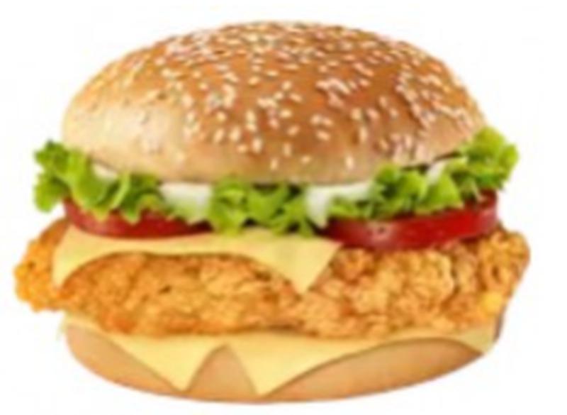 Состав: Большой бургер с нежным филе куриной грудки в хрустящей панировке, сыром Эмменталь, сочными ломтиками помидора, свежим салатом и специальным соусом на булочке с кунжутом