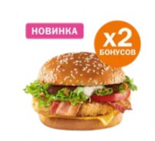 Состав: Сочная и пикантная куриная котлета в хрустящей панировке, сыр Чеддер, салат Айсберг, ароматный бекон, жаренный лук, ломтик помидора, свежий салат, специальный соус и булочка с кунжутом, политая подкопчённым, солоновато-сладким Сычуаньским соусом.