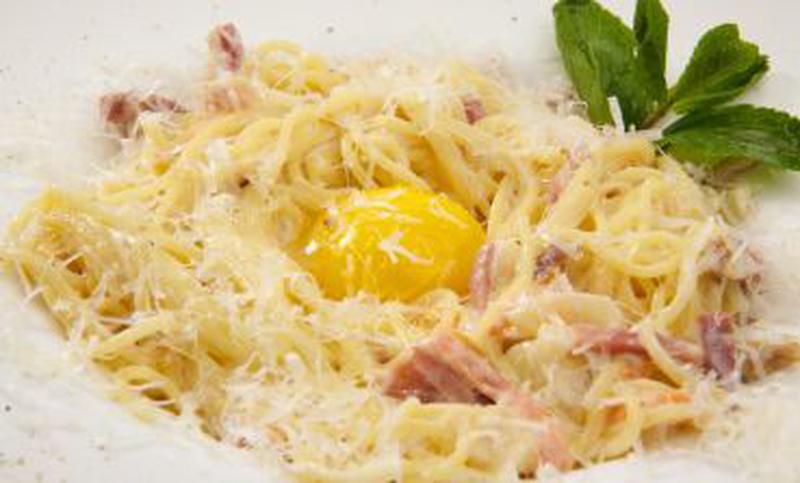 Состав: Классическая паста с сырокопченым беконом, сливками, сыром пармезан и куриным яйцом.