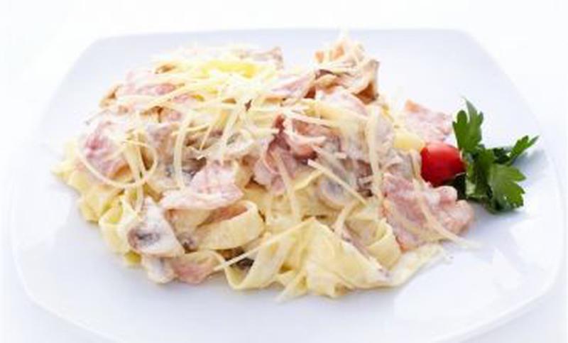 Состав: Паста с ветчиной и грибами в сливочном соусе с зеленью.