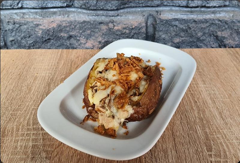 Состав: Картофель, сливочное масло, куриное филе, шампиньоны, сыр моцарелла, сливочно-чесночный соус, лук фри