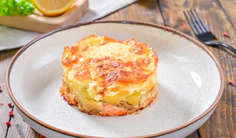 Состав: Филе горбуши, картофель, майонез и лук, запечённые под сырной корочкой.