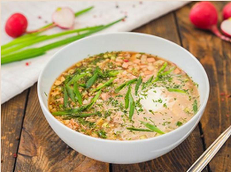 Состав: Сосиски, картофель, яйцо, огурец, редис, лук зелёный, укроп, горчица, сметана, квас.