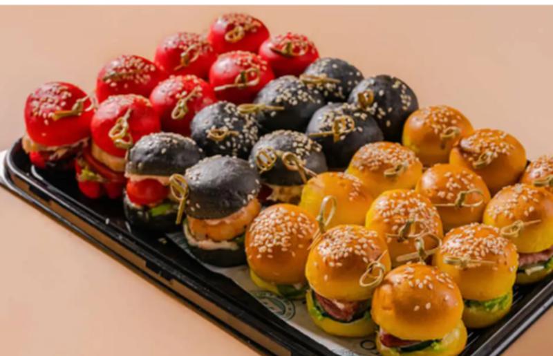 Состав: Набор мини-бургеров. Бургер с копчёной колбаской, майонезным соусом с чесноком, салатным миксом и огурцом - 8 шт.; Бургер с карбонадом и корнишонами, майонезным соусом с чесноком и салатным миксом - 4 шт.; Черные бургеры с креветкой, сливочным соусом, салатным миксом и черри - 8 шт.; Красный бургер с соусом цезарь, салатным миксом, томатами и копчёной курочкой - 8 шт.