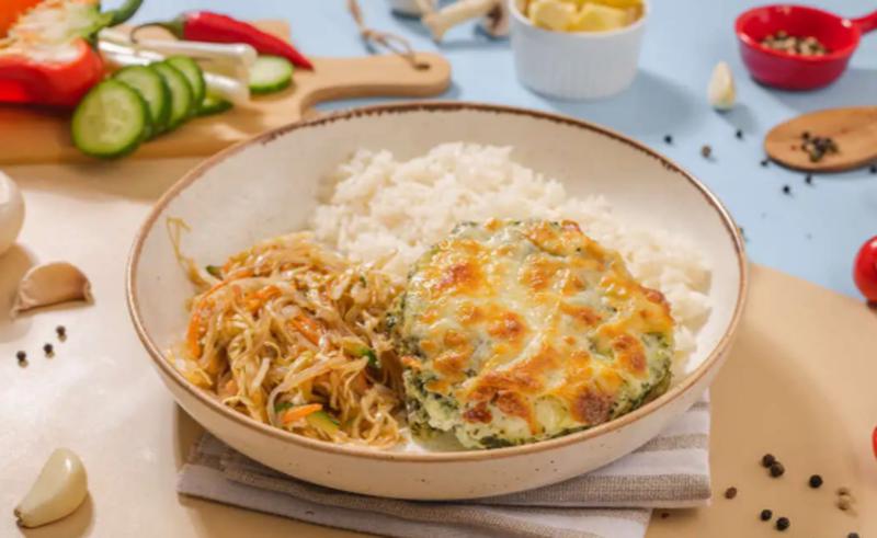 Состав: Филе белой рыбы с шампиньонами, шпинатом, луком, соусом Бешамель и сыром моцарелла. Доставляется с гарниром из риса и лёгким салатом из капусты, огурца, моркови и фунчозы.