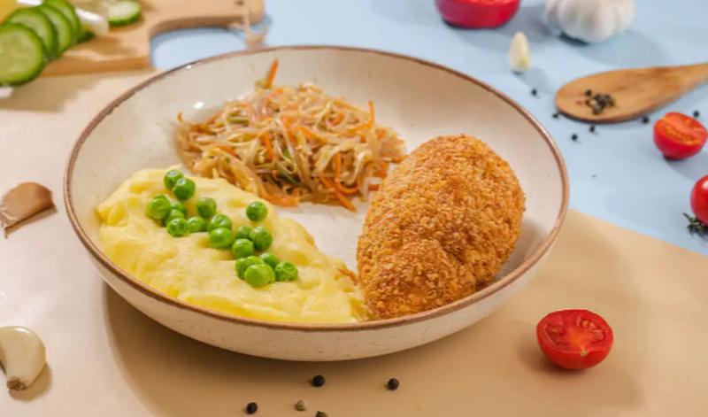 Состав: Доставляется с гарниром из картофельного пюре, зелёного горошка и лёгкого салата из капусты, огурца, моркови и фунчозы.