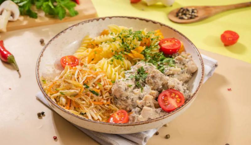 Состав: Курочка в сливках, с луком, шампиньонами, чесноком и зеленью. Доставляется с гарниром из лапши, черри и лёгким салатом из капусты, огурца, моркови и фунчозы