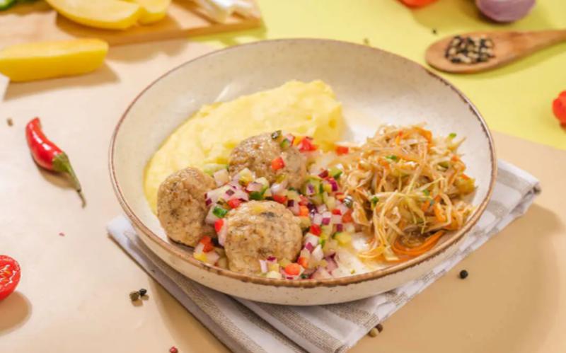 Состав: Митболы из куриного фарша. Конкассе из томатов, свежего огурца, корнишонов, перца болгарского и лука. Доставляется с гарниром из картофельного пюре и лёгким салатом из капусты, огурца, моркови и фунчозы.