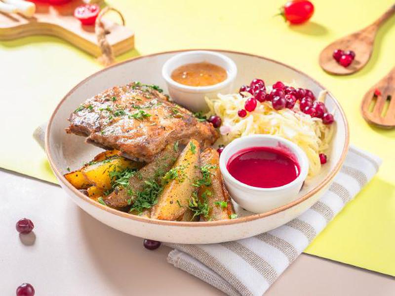 Состав: Доставляется с гарниром из картофеля и салатом из белокочанной капусты, клюквы и французского соуса.