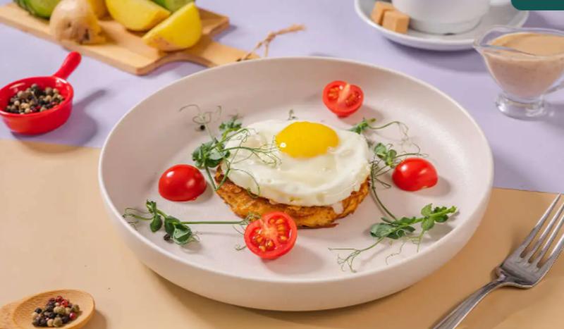 Состав: Картофельный драник с тёртым сыром, копчёной куриной грудкой и яйцом. Оформляется черри и микрозеленью.