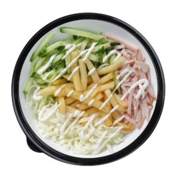 Состав: Огурец, картофель фри, карбонад, сыр, майонез.