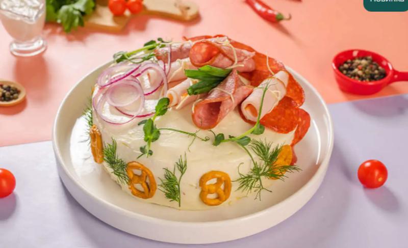 Состав: Бисквит с грецким орехом, промазывается майонезным соусом с чесноком. Начинка из колбасы, куриной грудки, корнишонов и голландского сыра. Крем: майонез, творожный сыр, сливки. Оформляется колбаской пепперони, рулетиками из колбаски и карбонада, луком, зеленью и печеньками.