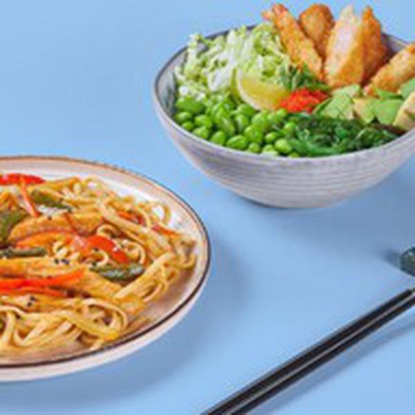 Состав: Вок с курицей терияки, поке с креветкой панко.