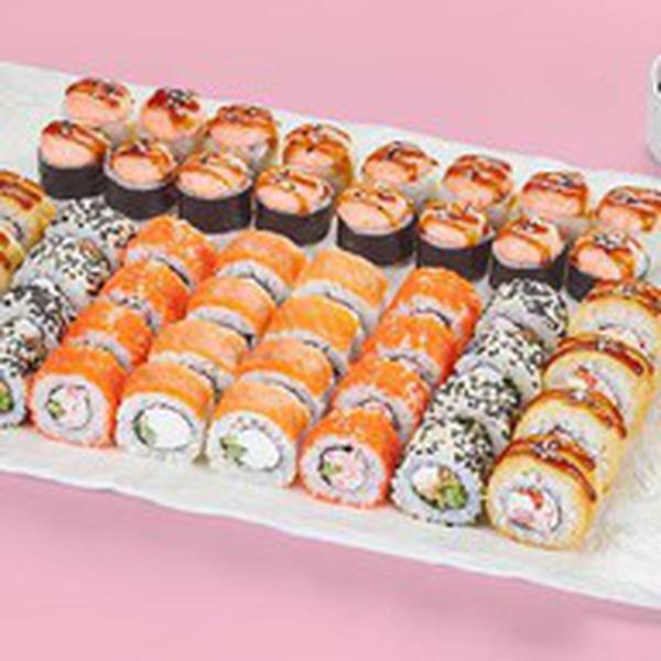 Состав: Калифорния супер лайт (8 шт.), Филадельфия лайт с огурцом (8 шт.), Гейша (8 шт.), Нежный с курицей (8 шт.), Южный (8 шт.), Канада (8 шт.) *Не забудьте заказать имбирь, васаби и соевый соус. Они не входят в стоимость заказа.