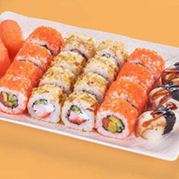 Состав: Калифорния с лососем (8 шт.), Бонито с креветкой (8 шт.), Суши с лососем (3 шт.), Суши с угрем (3 шт.) *Не забудьте заказать имбирь, васаби и соевый соус. Они не входят в стоимость заказа.