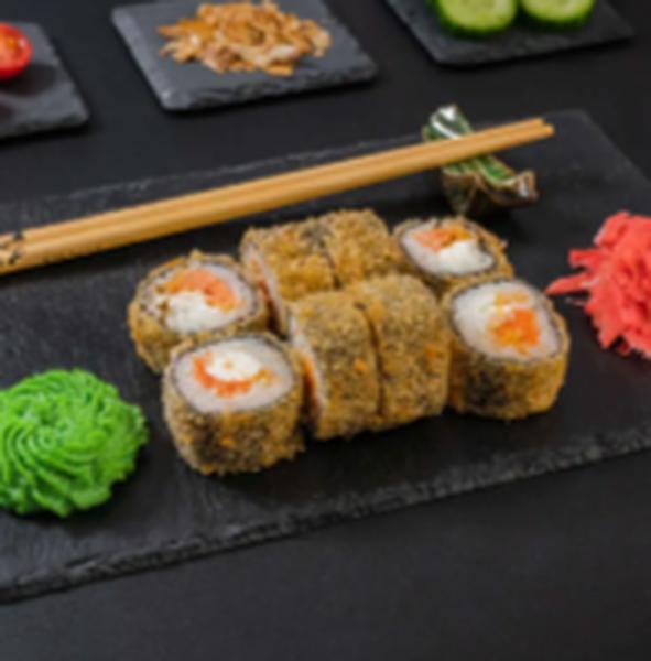 Состав: Лосось, рис, нори, сыр творожный, острый соус Кимчи, сухари панко.