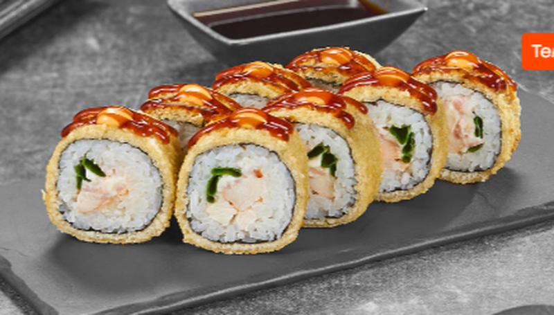 Состав: Курица, зеленый лук, монако с беконом, темпурный кляр, панировочные сухари, унаги соус, спайси соус, рис, нори
